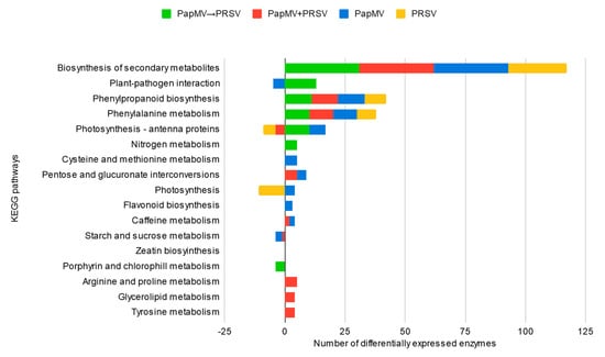 The last approach involved an enrichment analysis of reported metabolic pathways in KEGG. For this analysis, we subtracted all the annotated enzymes from the DEGs and mapped their identifications (IDs) to KEGG (Figure 5). Out of 16 metabolic pathways enriched in all conditions, we found upregulated enzymes for biosynthesis of secondary metabolites, phenylpropanoid biosynthesis, and phenylalanine metabolism. Other pathways are differentially enriched. Plant–pathogen interaction is enriched in both antagonism (with upregulated enzymes) and PapMV (with downregulated enzymes). Due to the phenotype of PRSV infection and synergism, photosynthesis metabolism is enriched with downregulated enzymes in both conditions as expected. In PapMV infection, porphyrin and chlorophyll metabolism include downregulated enzymes. The remaining metabolic pathways have upregulated enzymes for cysteine and methionine, as well as flavonoid biosynthesis for PapMV, and upregulated enzymes for pentose and glucuronate interconversions and caffeine metabolism for both PapMV and synergism. For the same two conditions, starch and sucrose metabolism are downregulated. Three metabolic pathways (arginine and proline, glycerolipid, and tyrosine metabolisms with upregulated enzymes) were only found for synergism. Finally, nitrogen metabolism with upregulated enzymes is only enriched in antagonism and corresponds to the organonitrogen compound response seen in Figure 3A. Validation of bioinformatic results via qRT-PCR was carried out for the following 12 candidate genes: WRKY 18, WRKY 33, WRKY 53, TIR-NBS-LRR, RDR1, DCL2, DCL4, AGO2, RBOHD, SOD1, LOX2, and LRR-RK. For all genes, except RBOHD, real-time quantification corroborated the accuracy of bioinformatic analyses (Table S1, Supplementary Materials).