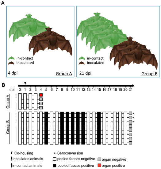 Experimental design. (A) Group A consisted of two inoculated bats in direct contact to naïve bats co-housed in one cage. At 4 dpi, the animals were euthanized and the organ material analyzed. Group B involved three inoculated bats co-housed with five naïve animals until 21 dpi. Group C (not presented) included two Seba’s short-tailed bats for negative tissue control. (B) Index bats were inoculated with 105.5 TCID50 of H18N11 oronasally. Pooled feces samples were taken at the indicated time points. White squares indicate absence, black squares the presence of viral RNA in feces samples. Grey squares show absence, the red squares presence of H18N11 RNA in at least one organ. Asterisks indicate seroconversion.