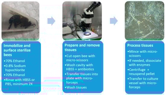 Cell culture initiations were performed in biosafety hoods with surface sterilized dissecting implements (Figure 1). Before dissection, the bees were immobilized in 70% ethanol (1 min) and surface sterilized in a series of treatments, 0.8% sodium hypochlorite (2–3 min), 70% ethanol (3–5 min) and rinsed 2–7 times in Hanks balanced salt solution (HBSS) or calcium, magnesium free–phosphate buffered saline (CMF-PBS). Bees were pinned dorsal-side up and an incision was made through the thorax and abdomen. The opening was flushed with HBSS containing antibiotics (0.1 mg/mL gentamycin, 0.5 μg/mL amphotericin B and/or 50–200 U/mL penicillin, 0.05–0.2 mg/mL streptomycin, Millipore Sigma), and selected tissues were removed with sterilized micro-forceps, washed three times in HBSS, and collected in wells of a standard 24-well tissue culture plate. Tissues were minced with sterilized micro-scissors, centrifuged if needed (800× g, 5 min, 4 °C), then transferred into either tissue culture plates (12-, 24-, or 48-well) or flasks (T12.5, T25) using cell culture media augmented with selected antibiotics (50–200 U/mL penicillin, 0.05–0.2 mg/mL streptomycin). In some initiations, 0.5 mL of an enzyme mixture (1 mg/mL collagenase/dispase, 0.05 mg/mL trypsin, Millipore Sigma) was added to dissociate the tissues. Enzyme-inoculated cultures were incubated at room temperature for 1h with gentle shaking. The dissociated tissues were centrifuged (800× g, 5 min, 4 °C), and transferred to culture containers as described.