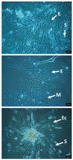 Representative images of attached, healthy cells from honey bee egg cell cultures in CLG#2 + FBS, passaged once, showing morphologically distinct cell types. E, elongated cells; S, spherical cells; M, multi-sided cells; Ec, elongated cells growing out of a cell clump. Bars, 50 µm.