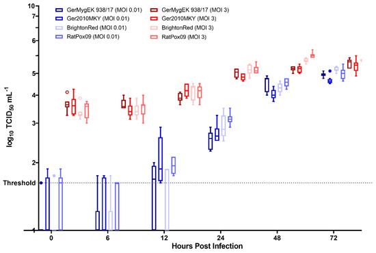 Comparison of replication characteristics of GerMygEK 938/17, Ger2010MKY, Brighton Red, and RatPox09. Vero76 cells were inoculated using multiplicities of infection (MOI)s of 0.01 and 3. Viral titers were determined by endpoint dilution assays. The mean and the standard deviations of four independent experiments, including two technical replicates per sample, are presented. The detection limit of our test was defined at 101.625 TCID50 mL−1 (threshold).