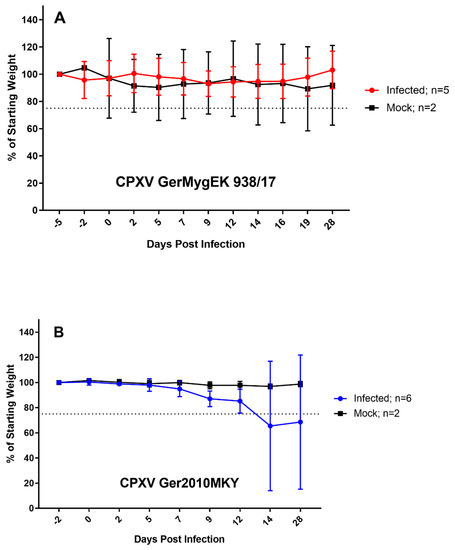 Body weight development of bank voles inoculated with (A) Cowpox virus (CPXV) GerMygEK 938/17 (bank vole-derived) or (B) CPXV Ger2010MKY (cotton-top tamarin-derived). The starting weight was set as 100%, and all values are means with standard deviations. Weight loss of more than 25% of initial weight (dotted line) was defined as termination criterion.