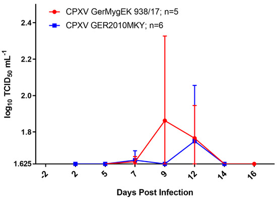 Viral shedding patterns of bank voles inoculated with CPXV GerMygEK 938/17 (red; n = 5) or CPXV Ger2010MKY (blue; n = 6) determined for buccal swabs. Values are the means with standard deviations. The detection limit of our test was defined at 101.625 TCID50 mL−1.