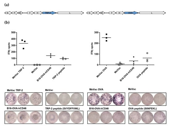 IFNγ ELISpot assays were performed as described previously [35]. Multiscreen HA plates (Millipore, Burlington, MA) were coated with 100 µL capture antibody anti-mouse IFNγ clone R4-6A2 (BD Pharmingen, Heidelberg, Germany) overnight at 4 °C. MC38-hCD46 cells were seeded in 6-well plates (2 × 105 cells per well) and infected at MOI 3. Twenty-four hours after infection, cells were trypsinized and used as target cells (5 × 104 cells per well) for CTLs. After blocking the plates, serial two-fold dilutions of CTLs beginning with 5 × 103 cells per well were performed. CTLs were co-cultured in triplicates with target cells, or with positive controls consisting of synthetic peptides (10 ng per well), uninfected B16-OVA-hCD46 cells (5 × 104 cells per well) or concanavalin A (Sigma, 2 µg per well). After 18 h, cells were removed and the secondary antibody (biotinylated anti-mouse IFNγ antibody (0.2 μg per well, clone XMG1.2; BD Pharmingen)) was added for 2 h at 4 °C, followed by incubation with a streptavidine alkaline phosphatase conjugate (BD Pharmingen, diluted 1:5000 in PBS) at room temperature. BCIP/NBT substrate (Sigma-Aldrich) was added, and the reaction was stopped with water. Spots were counted using a CTL ELISpot reader (CTL Europe, Bonn, Germany). For IFNγ ELISpot assays with DCs, DC2.4 cells were inoculated with MeVac variants at MOI 3. After 24 h, DCs were trypsinized and co-cultures were established with either CTLs or OT-I cells. In each well, 5 × 103 CTLs or isolated OT-I T cells were co-cultured with 5 × 104 DC2.4 cells inoculated with MeVac variants. IFNγ ELISpot assays were performed as described above. For UV inactivation of viruses, virus suspensions (4.1 × 106 ciu in 2 mL OptiMEM) were irradiated with 0.5 J/cm2 UV-C light on a UV Stratalinker 2400 (Stratagene, La Jolla, CA, USA). Virus inactivation was confirmed by titration assays.