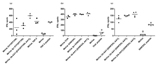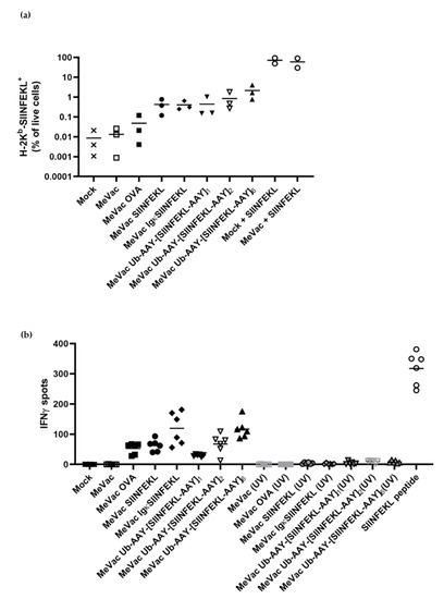 The epitope cassette variants included the epitope only (MeVac SVYDFFVWL, MeVac SIINFEKL), the epitope preceded by the mouse immunoglobulin kappa light chain (Igκ) leader sequence as secretion signal (MeVac Igκ SVYDFFVWL, MeVac Igκ SIINFEKL), as well as epitope strings with an N-terminal ubiquitin and flanked by proteasomal cleavage sites. The latter cassettes were conceptualized based on previous epitope vaccines targeted to the proteasome and on investigations of the epitope flanking residues [44,45,46,47,48,49]. Variants with five (SVDFFVWL) and one, two or six (SIINFEKL) epitope copies were generated (Figure 2c).