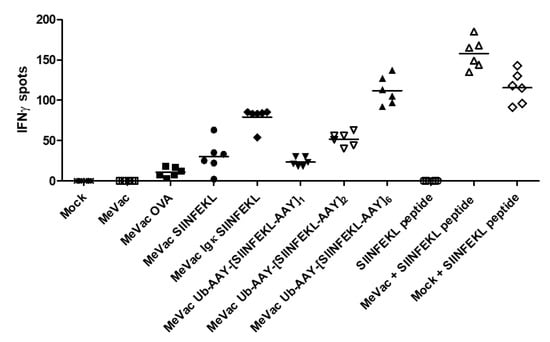 Dendritic cells exposed to measles vaccine viruses with epitope cassette variants can prime cognate T cells. DC2.4 cells were inoculated with measles encoding epitope cassette variants. After 24 h, co-cultures with naïve T cells from OT-I mice were established and IFNγ ELISpot assay was performed. Bars indicate mean value of six replicates for each condition. One representative of three independent experiments is shown.