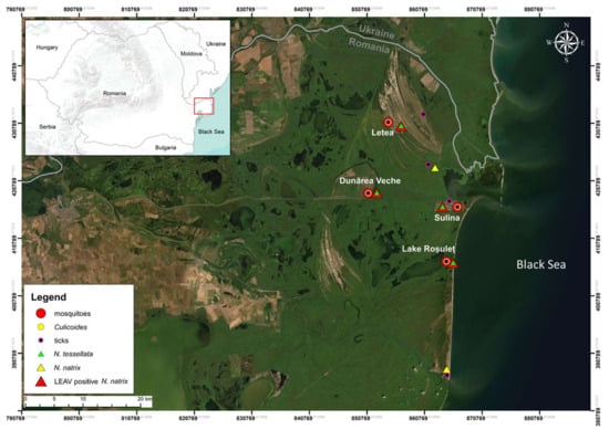 As one of Europe’s largest wetlands, the Danube Delta Biosphere Reserve (DDBR) located in the southeast of Romania, is a very biodiverse and heterogeneous complex of ecosystems []. The region is a major hub for bird migration along main African–Eurasian fly corridors, with ecoclimatic conditions suitable for abundant and diverse populations of arthropod vectors [,,,], which may allow pathogen import and maintenance [,,,].