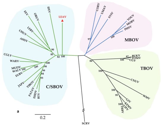 Comparison of main LEAV protein sequences to homologs of representative orbiviruses (Table 2) revealed identity values of 10–54% with Culicoides-/sand fly-borne orbiviruses (C/SBOV), 12–47% with tick and tick-borne orbiviruses (TBOV), and 11–46% with mosquito-borne orbiviruses (MBOV). The sequence identity between the polymerase (VP1) of LEAV and that of other orbiviruses was 33% (SCRV) to 54% (C/SBOV), above the 30% threshold proposed by [] for viruses within a single genus of the Reoviridae family. Analysis of the VP3 protein indicated that it is the T2 protein forming the subcore shell, homologous to the VP3 of BTV and of other C/SBOV []. Similarly to VP1, the T2 is highly conserved and the level of identity relative to other orbiviruses ranged from 22% (SCRV) to 53% (C/SBOV).