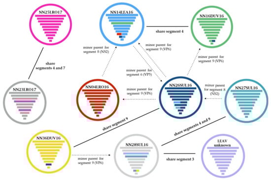 Graphical representation of gene reassortment and intragenic recombination between LEAV strains. Each colored circle represents a different LEAV strain. The 10 horizontal lines inside the circles represent the 10 genomic segments. Solid lines indicate reassortments of genes between different LEAV variants. Dashed arrows show the origins of gene fragments that have potentially been derived through recombination.