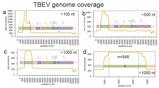 Genome layout and TBEV genome fragments represented in GenBank as of June 2019. Y-axis indicates the sequence coverage (the number of known sequences) for each genome position shown in X-axis. (a) Sequences shorter than 100 nucleotides were omitted from the analysis. (b) Sequences shorter than 500 nucleotides were omitted. (c) Sequences shorter than 1000 nucleotides were omitted. (d) The genomic region selected for the phylogenetic analysis is limited by two vertical lines.