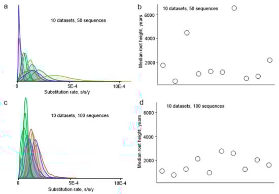 Random sampling of sequences from a large dataset was not a valid approach to simulate the actual sample bias in sequence datasets, because some research groups deposited dozens of almost identical sequences to GenBank, while others reported just a few unique sequences, and random sampling would preferentially pick sequences from large studies. To simulate the sample bias that could have existed 10 years ago more realistically, we designed an algorithm that mimics a situation when only few of the actual virus sequencing studies were done. Sequences from one study are usually deposited to GenBank at once and have sequential accession numbers. Blocks of sequences with sequential accession numbers were sampled from all available non-identical E protein coding sequences fragments with known isolation dates (551 sequences of 1028 nt) until there were at least 50 sequences in a simulated dataset. Ten random datasets were created. Then, these simulated datasets were used to infer phylogenetic relations of TBEV. The estimated mean substitution rate varied among simulated datasets more than 15-fold, between 0.22 × 10−4 and 3.84 × 10−4 substitutions per site per year (s/s/y), sometimes with non-overlapping 95% high probability density (HPD) intervals (Figure 2a). Similarly, the height of the trees (age of the most recent common ancestor (tMRCA) of TBEV) differed significantly (Figure 2b). Therefore, sample bias has a profound effect on the evolutionary estimates, which is not fully reflected by formal statistical support within an analysis. It is noteworthy that when the simulated datasets included 100 instead of 50 sequences, the effect of bias was much less pronounced (Figure 2c,d), and the inferred substitution rates varied just 3.6-fold, between 0.54 × 10−4 and 1.96 × 10−4. It is not possible to estimate the actual bias in the currently available dataset of 551 sequences, but the simulation results suggest that it is significantly smaller than in the dataset available just a decade ago.