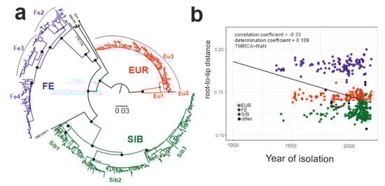 (a) Maximum likelihood tree for TBEV species (1028 nt). Black circles indicate high-level nodes that were supported by UFBoot values over 95% []. (b) Association between root-to-tip distance and time of isolation for the whole TBEV species.