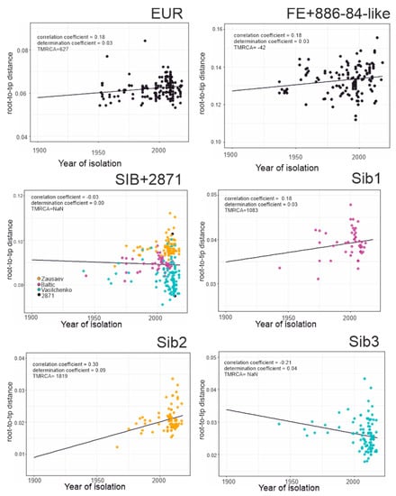 This study analyzed 551 near-complete E-gene sequences of TBEV (Figure 3a), including 181 sequences of the European subtype (Figure 3a, red branches, Figure 3b red circles), 232 sequences of the Siberian subtype (Figure 3a, green branches, Figure 3b green circles), and 125 sequences of the Far-Eastern subtype (Figure 3a, blue branches, Figure 3b blue circles) as well as 13 sequences with an uncertain subtype assignment (Figure 3a, black branches, Figure 3b black circles). The association between root-to-tip distance and time of isolation demonstrated the absence of a temporal signal for the TBEV species as a whole (Figure 3b), precluding molecular clock analysis of all TBEV subtypes in one dataset. Thus, the TBEV species had to be divided into three datasets: European subtype, Far-Eastern subtype (including “uncertain” Baikalian strains 886-84 and 178-179), and Siberian subtype (including the “uncertain” sequence TBEV-2871). The European and Far-Eastern subtypes demonstrated a weak temporal signal (Figure 4) and could be analyzed using the molecular clock. For the whole Siberian subtype, genetic distances were independent of isolation time, similar to the entire TBEV, but two of the three Siberian subtype groups (Figure 3a, Sib1 and Sib2) had a temporal structure (Figure 4). For consistency with the subtype assignment, the Siberian subtype was analyzed as a whole, but dating of the deep node was regarded as unreliable.