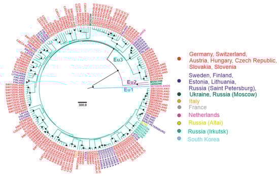 Within all subtypes and within most of the smaller groups in these subtypes, there were examples of long- and medium-range virus transfers, which occurred within the last 300 years, and some of them within the last few decades (Table 1). Here, we define long- and medium-range virus transfers as the detection of genetically close viruses in geographically non-overlapping regions (right panel, Figure 5, Figure 6 and Figure 7). Dating of these events may lack precision due to both calculation uncertainty and TBEV biology (e.g., a possibility of long-term virus preservation during a tick diapause), but their very recent occurrence is evident. It is noteworthy that more examples of such long-distance transfers have been reported previously, but were not accounted for in this study due to the short length of analyzed sequences. For example, TBEV-Fe was found in ticks collected in the Republic of Moldova [], and all three TBEV subtypes were found in Crimea []. Such transfers could be mediated by human activity or by naturally migrating animals, including bats and birds, which were infected or carried infected ticks. It was demonstrated that TBEV in ticks can be transported by birds []. In that study, 57 of 91 fieldfares captured in the south of Western Siberia were carrying a total of 510 ticks, and more than half of them contained TBEV RNA. Also, a recent detection of TBEV in Great Britain was attributed to migratory birds that hypothetically transferred this virus from Norway []. Thus, birds cannot be discarded as a TBEV dissemination vector. However, this mechanism should have produced some sort of mixing gradient among regions, with more common medium-range than long-range transfers. There are many extremely long-distance transfers without any intermediate virus isolations, for example between Europe and South Korea or between Central Siberia and Sakhalin Island in the Pacific (Table 1). Such long-distance “quantum” transfers are not compatible with a mixing gradient and with natural transfers. Human-assisted transfer is a more plausible explanation in this case. It could be mediated, for example, by trafficking of domestic animals carrying infected ticks. Another more recent example of anthropogenic activity that could facilitate TBEV spread comes from mid-20th century Soviet Union. It has been suggested that a large-scale introduction of novel wildlife species to new habitats to improve hunting capacity has complemented to the intermixing of TBEV subtypes []. Very limited geographic clustering within the Eu3 subgroup as compared to other subgroups would then be compatible with higher population density and intensity of human activity in Europe.