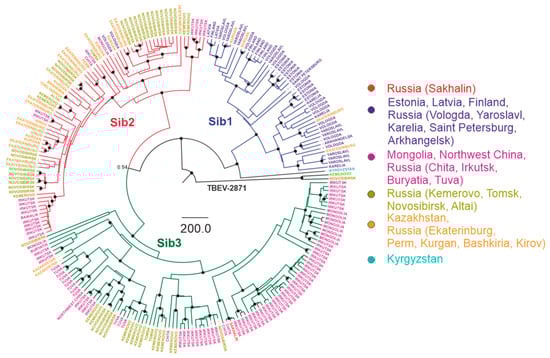 Bayesian phylogenetic analysis of near-complete E-gene sequences of Siberian TBEV. Branches are color-shaded according to described groups. Tree tips are named according to region of isolation. Countries or country regions of virus sampling were grouped into six color-coded geographical regions. Node posterior probabilities above 95% are shown by black circles at the relevant nodes.