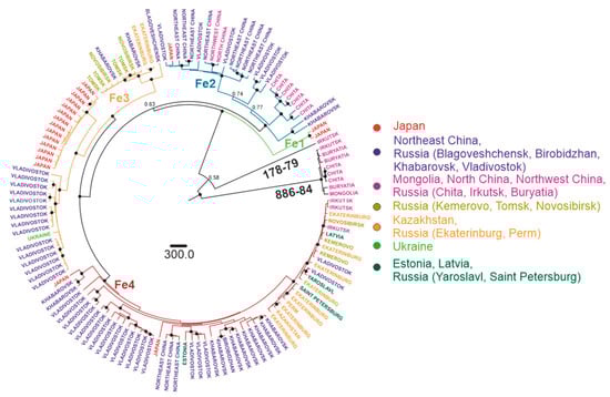 For the Far-Eastern subtype, there were four subgroups predominantly found in a specific area: the Japan subgroup (Fe1, tMRCA 64 (31–120) years ago), Manchuria (Northeast China and Russian Far East) region subgroup (Fe2, tMRCA 528 (387–1043) years ago), Pacific-Siberia subgroup (Fe3, tMRCA 528 (317–843) years ago and Pacific-Ural subgroup (Fe4, tMRCA 479 (281–743) years ago). Similar to the Siberian type, within these groups, there were single isolates from very distant locations, such as Vladivostok-Crimea, Vladivostok-Estonia, Khabarovsk-Novosibirsk, etc. (Figure 7, Table 1).