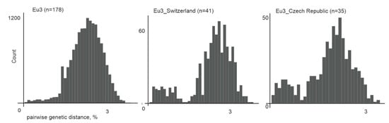Pairwise genetic distances for all Eu3 representatives (n = 178), Eu3 from Switzerland (n = 41), and Eu3 from the Czech Republic (n = 35).