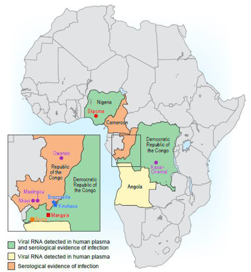 To date, EKV-2 RNA has been detected in plasma samples from three individuals: the woman in Nigeria [34], the Chinese worker in Angola [56], and one healthy nurse in the Democratic Republic of the Congo (Table 1). The detection of viral RNA in these countries suggests that EKV-2 is circulating within a vast geographic area that includes more than 300 million people.