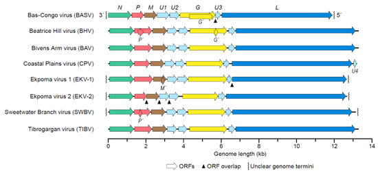 Since 2012, RNA genomes of three novel rhabdoviruses, called Bas-Congo virus (BASV), Ekpoma virus 1 (EKV-1), and Ekpoma virus 2 (EKV-2), have been discovered by metagenomic next-generation sequencing (mNGS) of plasma samples from humans in Central or Western Africa [33,34]. BASV was found in a severely ill male in the Democratic Republic of the Congo and EKV-1/2 were found in two healthy females in Nigeria. All three viruses cluster phylogenetically with poorly characterized rhabdoviruses of the genus Tibrovirus. Eight genetically distinct tibroviruses are known, including the three viruses associated with humans [33,34,35,36,37,38]. All tibroviruses share a similar genome organization containing at least three unique, genus-specific open reading frames (ORFs) of unknown function [3,39,40,41,42]. The majority of nonhuman tibroviruses have been isolated from biting midges (Diptera: Ceratopogonidae: Culicoides), although one tibrovirus has been isolated from a healthy steer (Artiodactyla: Bovidae: Bos taurus Linnaeus, 1758). Seroprevalence studies suggest that infection of cattle is likely to be very common [35,36,37,39,43,44,45,46]. Until the discovery of BASV and EKV-1/2, tibroviruses have been largely ignored because none of them appeared to produce overt disease in cattle or to be capable of infecting humans.