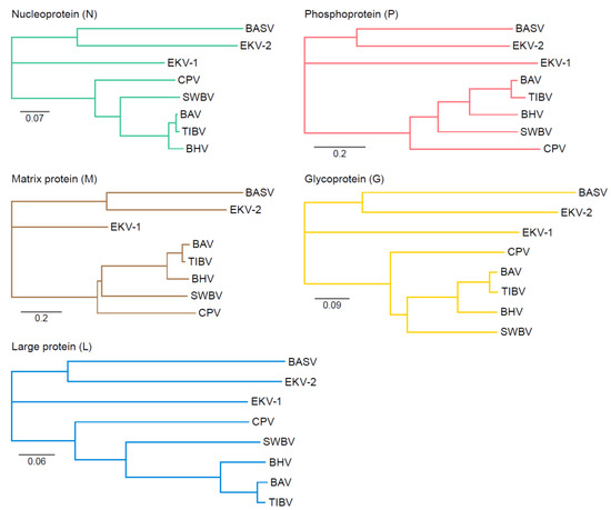 Tibrovirus phylogeny. Multiple sequence alignments of tibrovirus nucleoprotein (N), phosphoprotein (P), matrix protein (M), glycoprotein (G), and large protein (L) full-length amino acid sequences were performed using Multiple Alignment with Fast Fourier Transform (MAFFT). Nearest-neighbor and unrooted trees were generated using Geneious Prime 2019. Scale bar = substitutions/site.