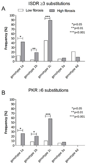 Nevertheless, according to genotype, a significantly higher proportion of virus-carrying ≥3 substitutions in ISDR and ≥6 in PKR-bd was observed in patients who developed HCC infected with genotype 2c (5/5, 100%) than with patients infected with genotype 1b (2/8, 25%) (p < 0.001). No virus carrying high substitution levels was observed among HCC patients infected with genotypes 1a, 3a, and 4d.