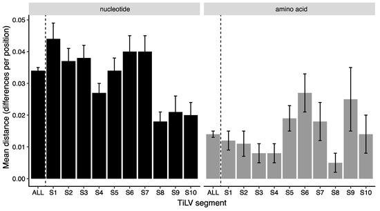 Mean TiLV nucleotide and amino acid distance (differences per position), based on alignment of the full coding regions of seven genomes from Israel, Thailand, Ecuador, Peru and Bangladesh. Error bars show estimated variance based on 1000 bootstrap replicates, and models of nucleotide substitution for each segment are as listed in Figure 4.