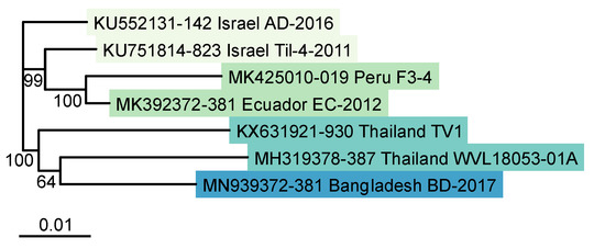 The maximum likelihood phylogenetic tree based on the concatenated multi-locus alignment of all ten segment coding regions grouped the Bangladesh TiLV isolate BD-2017 with the two Thailand references (TV1 and WVL18053-01A), whereas the two South American strains (Peru F3-4 and Ecuador EC-2012) clustered together with Israel Til-4-2011 (Israel AD-2016 could not be resolved) (Figure 2). This branching pattern resembles the Thai and Israeli clades identified by Pulido et al. 2019 [14], though their analysis was able to include AD-2016 in the Israeli clade. Given the likely import into Bangladesh of TiLV-infected materials from Thai hatcheries between 2012 and 2017 [10], the similarity of the Bangladesh strain to the two Thai references is not surprising.