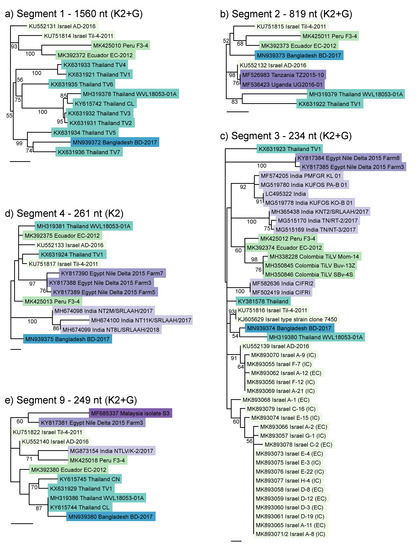 Compared with the topology of the concatenated tree in Figure 2, when these shorter sequence fragments from additional isolates were included in phylogenetic analyses, branching patterns generally changed, and both resolution and node support tended to decrease (Figure 3). The exception was segment 1 (Figure 3a), whose topology mirrored the concatenated tree, though unlike the other trees, segment 1 was based on the whole segment coding region (1560 nt) rather than a short fragment, and all the additional references were from Thailand and formed a distinct clade that also included the Bangladesh TiLV. The other trees with additional references (segments 2, 3, 4, 9) showed a different branching pattern to the concatenated tree. With segment 2, two African strains (from Tanzania and Uganda) clustered with Israel AD-2016, while the other Israel strain formed a cluster with the two South American and the Bangladesh strain. Segment 3 formed some regional clusters (South America, India, Egypt), but it split the Thai sequences, and formed three separate Israel clusters (though did not distinguish the two clades identified by Skornik et al. 2019 [22]). Furthermore, the relationships between the regions could not generally be resolved. Segment 4 showed poor resolution and node support. The sequences from Egypt and India formed two distinct clusters, but the other strains could not be resolved. Segment 9 also showed poor resolution and node support, splitting the South American strains.