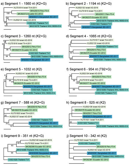 However, while some segments, notably 2 and 7, showed clustering that reflected the whole genome pattern (albeit segment 7 had poorer resolution and node support), other segments exhibited different branching patterns with high node support (Figure 4). With segment 1, the Bangladesh isolate BD-2017 clustered not with Thai references but rather with Israel AD-2016. With segment 4, Thailand TV1 clustered with both Israel isolates, but with segment 5, the two Thailand isolates were separated, while BD-2017 clustered with the Israel and South American isolates. With both segment 5 and 6, Israel Til-4-2011 was grouped with Ecuador EC-2012, and with segment 9, the South American and Thai clades were both split, with Bangladesh TiLV grouped with Thailand WVL18053-01A.
