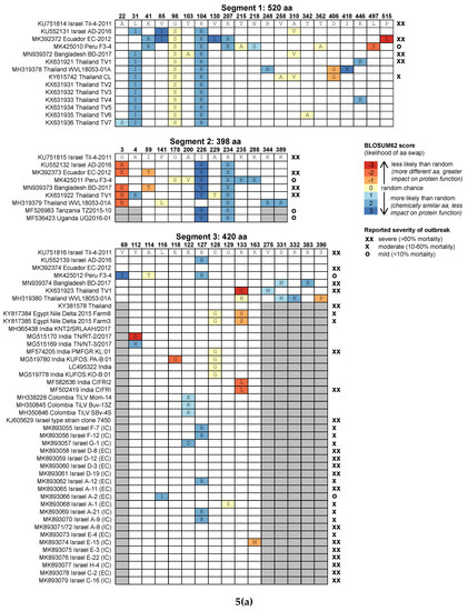 We found no obvious pattern linking amino acid substitutions and outbreak severity (Figure 5a,b), though this analysis was hampered by a lack of disease severity metadata for many of the reference sequences. Furthermore, only one of the isolates with full coding region sequences and severity data, Peru F3-4, was not from a severe outbreak, and so we had few examples of asymptomatic or low-severity strains. The Peru F3-4 isolate, which was asymptomatic, did have differences in several amino acids from the type strain in most segments, but other isolates from severe outbreaks had similar numbers of substitutions, with similarly high predicted impact on protein structure and function, notably EC-2012 and TV1. The only suggested link between specific amino acid changes and severity came from the set of segment 3 sequences from Israel [22], which all had severity information. A change from lysine (K) to arginine (R) at position 127 appears only in moderate strains and not in any severe strain. However, this change is between two positively charged hydrophilic amino acids, and so is not predicted to have a large impact on protein structure and function, and it is not present in all moderate strains from that study.