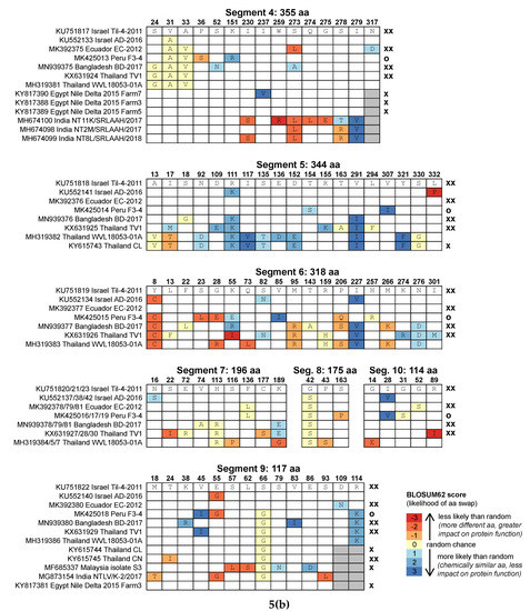 However, most nucleotide substitutions in TiLV alignments are silent mutations (i.e., they do not result in an amino acid change, and therefore do not affect protein structure and function), and some TiLV strains that clustered into separate lineages at the nucleotide level have segments with identical amino acid sequences (Figure 5a,b). The Bangladesh BD-2017 segment 2 amino acid sequence is identical to that of Ecuador EC-2012. Segment 3 of Ecuador EC-2012 is identical to the Israel type strain, as are both the segment 4 amino acid sequences of two of the Egypt strains (Farm3 and Farm5).