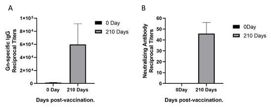 Sera response in a rhesus monkey immunized with recombinant human adenoviruses type 4 expressing Rift Valley fever virus Gn and Gc protein (rHAdV4-GnGcopt). (A) Serum samples were collected at 0 and 210 days after immunization and subjected to ELISA analysis of IgG antibodies to the Rift Valley fever virus (RVFV) Gn. The titers were calculated as reciprocal endpoints. The cutoff values were calculated as the mean optical density of control serum (1:8100 dilution) multiplied by 2.1. Data are presented as the means ± standard deviations (error bars) from three independent trials. (B) Serum samples were collected at 0 and 210 days after immunization and subjected to virus neutralization test via RVFV MP-12 strains expressing eGFP (RVFV-SeGFP). The neutralizing antibody titers were calculated using the Reed–Muench method. Data are presented as the means ± standard deviations (error bars) from three independent trials.