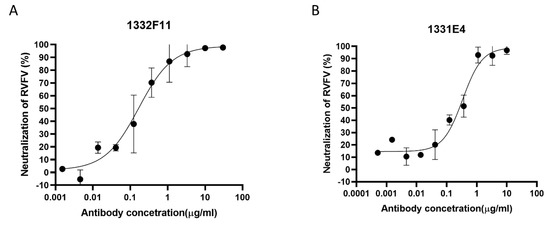 Sera were heat-inactivated for 2 h at 56 °C before use. Threefold serial dilutions of sera (40-fold in the initial dilution) in 96-well plates (CoStar, Washington, DC, USA) were incubated with an equal volume of RVFV-SeGFP (100 TCID50 per well) for 1.5 h at 37 °C. Huh7 cells (20,000) were then added to each well, followed by incubation in a 37 °C, 5% CO2 incubator for 48 h. The eGFP was detected using Cytation1 (Bio-Tek, Winooski, VT, USA). The neutralizing antibody titers were calculated using the Reed–Muench method [24]. To measure the neutralization activity of each RVFV monoclonal antibody, the isolated monoclonal antibodies were serially diluted in 96-well plates (CoStar, Washington, DC, USA) and incubated with an equal volume of RVFV-SRluc (100 TCID50 per well) for 1.5 h at 37 °C. Then, 20,000 Huh7 cells were added to each well. The cells were incubated in a 37 °C, 5% CO2 incubator for 24 h. The luciferase activity (Luc) was measured via the Renilla luciferase assay system (Promega, Madison, WI, USA). The neutralization of RVFV (%) was calculated as (1 − Lucmeasured/Lucvirus control) × 100. Sigmoid neutralizing curves were generated through GraphPad Prism 8 (GraphPad, San Diego, CA, USA).