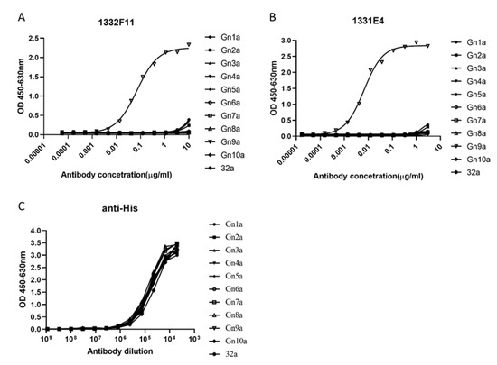 ELISA analysis of NAbs to Gn truncated segments. (A,B) The truncated segments, coated at 0.2 μg/well in a 96-well plate, were incubated with threefold serial dilutions of the indicated NAbs. 1332F11 and 1331E4 were diluted at 10 μg/mL and 3 μg/mL in an initial well, respectively. 32a represents pET-32a empty vector. (C) The anti-His antibody (1:5000 initial dilution) was used as positive control. The optical density (OD) was measured at OD450–OD630. Sigmoid curves were generated through GraphPad Prism 8. Sigmoid neutralizing curves were generated through GraphPad Prism 8.