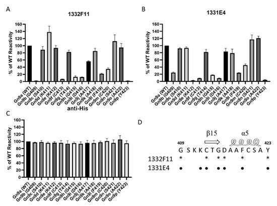 To further confirm the residues in Gn9a critical for binding the two NAbs, we mapped these amino acid residues using alanine-scanning mutagenesis. Each amino acid residue in the polypeptides 409GSKKCTGDAAFCSAY423, carried by Gn9a, was individually mutated to an alanine (alanine residues were mutated to serine) (Table 3). The results show that six amino acids (G409, C413, G415, D416, F419, and Y423) within Gn9a were critical for recognition of Gn by 1332F11, and seven amino acids (G409, K412, C413, G415, D416, F419, and Y423) were identified as critical in the case of 1331E4 (Figure 5A,B). Interestingly, even though 1331E4 and 1332F11 are two distinct antibodies, the six amino acids critical for binding and recognition by 1332F11 were also critical for 1331E4.