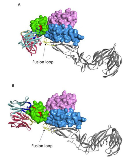 As previously described, Gn and Gc proteins exist as a heterodimer on the viral surface [15,27]. Next, we superimposed the Gn component of our NAb–Gn docking model onto a reported model of assembled RVFV Gn–Gc (PDB ID: 6F9F). The results show that the sites in Gn that supporting binding of NAbs were close to the fusion loop in Gc (Figure 7).