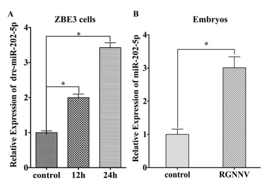 miR-202-5p is upregulated in zebrafish during red spotted grouper nervous necrosis virus (RGNNV) infection. (A) ZBE3 cells were infected with RGNNV for different periods. (B) Zebrafish embryos were infected with RGNNV for 24 h. The expression of miR-202-5p was tested by qRT-PCR. The relative expression of miR-202-5p was normalized with 18s rRNA and represented as fold induction relative to the transcription level in the control, which was regarded as 1. Asterisks indicate the significant differences between groups (*: p < 0.05).