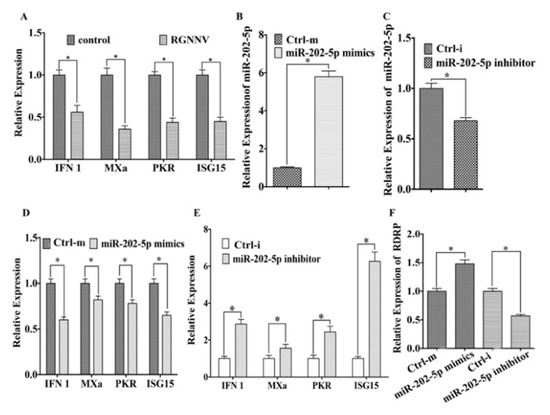 miR-202-5p inhibits antiviral genes expression and promotes RGNNV infection in vitro. (A) The expression of IFN 1, PKR, MXa, and ISG15 mRNA post RGNNV infection. ZBE3 cells were infected with RGNNV (MOI=1) or uninfected (control) for 24 h, total RNA was extracted for qRT-PCR assays. (B,C) Effects of miR-202-5p mimics and inhibitor on expression of miR-202-5p. ZBE3 cells were transfected with miR-202-5p mimics and control mimics (Ctrl-m) (B) or with miR-202-5p inhibitor and inhibitor control (Ctrl-i) (C) for 48 h, and then total RNAs were extracted to examine the expression of miR-202-5p. (D–F), Effects of miR-202-5p mimics and inhibitor on expression of IFN 1, PKR, MXa, ISG15, and RGNNV viral RNA-dependent RNA polymerase (RDRP). ZBE3 cells were transfected with miR-202-5p mimics and Ctrl-m (D) or with miR-202-5p inhibitor and Ctrl-i (E) for 24 h before RGNNV infection. At 24 h post RGNNV infection, the expression levels of IFN 1, PKR, MXa, ISG15 (D,E) and RDRP (F) were detected by qRT-PCR. The relative expression levels were normalized with 18s rRNA and represented as fold induction relative to the transcription level in the control, which was regarded as 1. Asterisks indicate the significant differences between groups (*: p < 0.05).
