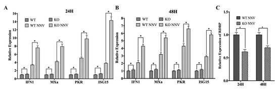 miR-202-5p knockout inhibits antiviral genes expression and promotes RGNNV infection in vivo. Adult wild type (WT) and miR-202-5p-/- zebrafish (KO) were intraperitoneally injected with RGNNV or the same volume of PBS. Twenty-four and forty-eight hours later, zebrafish were harvested and expression levels of IFN 1, MXa, PKR, and ISG15 (A,B) and RDRP (C) were analyzed by qRT-PCR. The relative expression levels were normalized with 18s rRNA and represented as fold induction relative to the transcription level in the control (WT), which was regarded as 1. Asterisks indicate the significant differences between groups (*: p < 0.05).