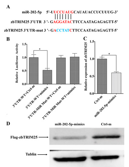 zbTRIM25 is the target of miR-202-5p. (A) The potential miR-202-5p binding sites in the zbTRIM25-3′UTR and its mutant. (B) miR-202-5p mimics and Ctrl-m were co-transfected into HEK 293T cells with luciferase reporter plasmid of wild-type zbTRIM25-3′UTR plasmid (3′UTR-WT) and mutant-type of zbTRIM25-3′UTR plasmid (3′UTR-miR Mut), respectively. (C) Overexpression of miR-202-5p in ZBE3 cells changes the zbTRIM25 mRNA level as measured by qRT-PCR. Asterisks indicate the significant differences between groups (*: p < 0.05). (D), Enhanced miR-202-5p expression suppressed zbTRIM25 protein levels in HEK 293T cells. HEK 293T cells were co-transfected with miR-202-5p mimics or Ctrl-m and pCMV-Flag-zbTRIM25 or pCMV-Flag vector for 48 h and harvested for a Western blot analysis, respectively.
