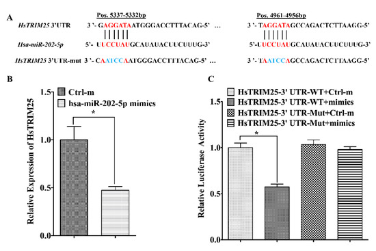Human tripartite motif-containing protein (HsTRIM25) is targeted by hsa-miR-202-5p. (A) Two potential hsa-miR-202-5p binding sites in the HsTRIM25-3′UTR and its mutants. (B) Overexpression of hsa-miR-202-5p in HEK 293T cells changed the endogenous HsTRIM25 mRNA level as measured by qRT-PCR. (C) The luciferase reporter vector encoding wild-type or mutated 3′ UTRs from HsTRIM25 was co-transfected into HEK 293T cells with hsa-miR-202-5p mimics or Ctrl-m, and luciferase activity was measured 48 h later. Asterisks indicate the significant differences between groups (*: p < 0.05).