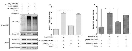 Co-IP and ubiquitination assays were performed as described previously [20,23]. HEK 293T cells in 10-cm plates were co-transfected with 10 μg of different plasmid combinations (4 μg of Flag-zbTRIM25, 4 μg of pEGFP-RIG-I, and 2 μg of HA-K63Ub) and 3.5 μg of miR-202-5p mimics or Ctrl-m. Then, the cells were lysed on ice with lysis buffer for 15 min at 48 h after transfection. The cell lysates were then immunoprecipitated with anti-GFP antibodies. Immunoprecipitates or whole-cell lysates were immunoblotted with anti-HA, anti-GFP, anti-Flag, and anti-Tubulin antibodies, respectively.
