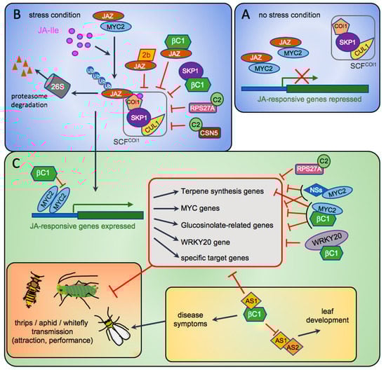 Model depicting the known targets of Cucumber mosaic virus (CMV)-2b, Tomato spotted wilt virus (TSWV)-NSs and begomovirus C2 and βC1 proteins in the pathways regulating plant defences and symptomatology. (A) In non-stressed conditions, the level of active jasmonate, Jasmonoyl-Isoleucine (JA-Ile), is very low. JAZ repressors bind to MYC2 to repress its transcriptional activation on downstream genes of the JA signalling pathway. (B) Under herbivore insect attack, the strong increase of JA-Ile triggers the assembly of a JAZ-COI1 co-receptor that will be recruited by the E3-ubiquitin ligase SCFCOI1 (SKP1/Cullin/F-box). JAZ repressors will undergo ubiquitination and be addressed to the 26S proteasome for degradation. (C) The transcription factor MYC2 and others are released and can activate the genes involved in JA response, like those in terpene biosynthesis, glucosinolate production, and other responses (grouped in the red box). During viral infection, viral suppressors of RNA silencing are produced and can antagonise some of these responses. Here are shown four of them, the CMV-2b (panel B), the begomovirus C2, the begomovirus satellite βC1 (panels B and C) and the tospovirus NSs (panel C), interacting with their known targets compromising the SCFCOI1 complex activity (panel B) or some specific gene activations (panel C). Red bar-heads indicate the inhibitory effect of the viral proteins. The regulations between the various host genes are not reported.
