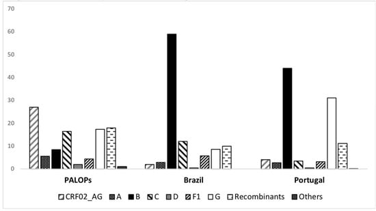 Subtype distribution stratified by country of origin of the patient. Portuguese Speaking African Countries (PALOPs) n = 1281, Brazil n = 209 and Portugal n = 3687.