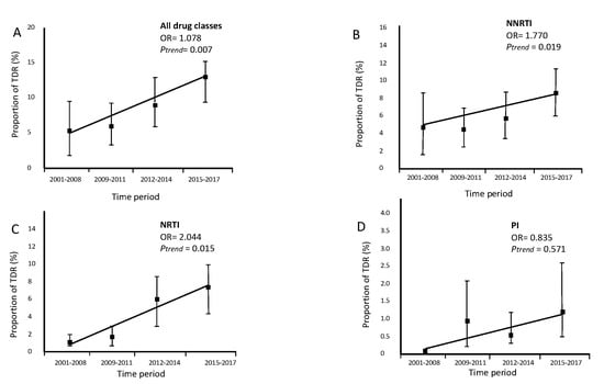 Trends of proportion of transmitted drug resistance (TDR) in migrants followed up in Portuguese hospitals (2001–2017). N(2001–2008) = 137, N(2009–2011) = 325, N(2012–2014) = 228, N(2015–2017) = 327. (A) Trend for overall TDR. (B) Trend for transmitted nucleoside reverse transcriptase inhibitor (NRTI) resistance. (C) Trend for transmitted NNRTI resistance. (D) Trend for transmitted protease inhibitors (PI) resistance.