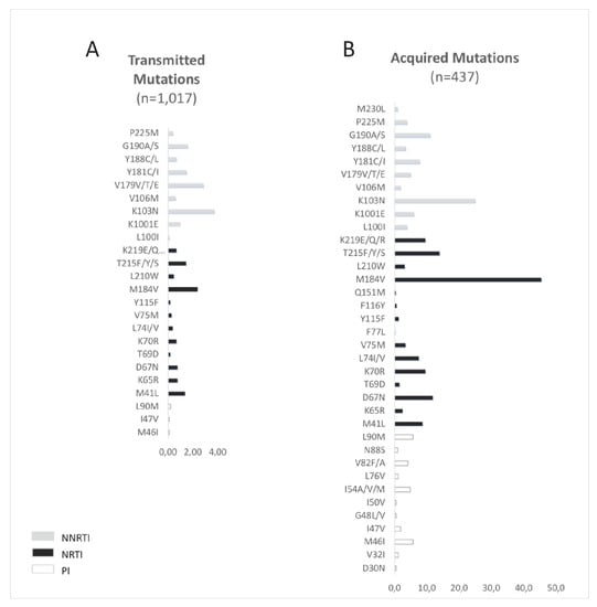 The most prevalent mutations conferring resistance to NRTIs, in treated patients, were M184IV (45.5%) and TAMs, such as T215YF (18%). K103NS (24.9%) and L90M (5.7%) were the most prevalent mutations conferring resistance to NNRTIs and to PIs, respectively (Figure 3).