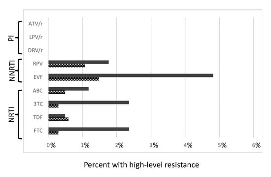 - Gupta, R.K.; Gregson, J.; Parkin, N.; Haile-Selassie, H.; Tanuri, A.; Andrade Forero, L.; Kaleebu, P.; Watera, C.; Aghokeng, A.; Mutenda, N.; et al. HIV-1 drug resistance before initiation or re-initiation of first-line antiretroviral therapy in low-income and middle-income countries: A systematic review and meta-regression analysis. Lancet Infect. Dis. 2018, 18, 346–355. [Google Scholar] [CrossRef]