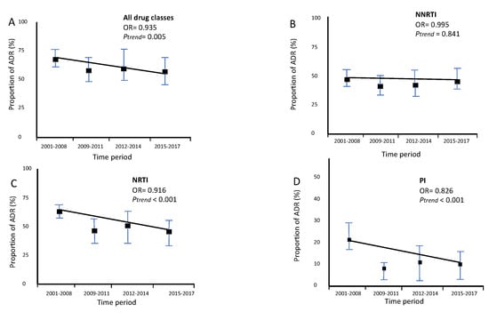 Trends of proportion of ADR in migrants followed up in Portuguese hospitals (2001–2017). N(2001–2008) = 173, N(2009–2011) = 127, N(2012–2014) = 51, N(2015–2017) = 86. (A) Trend for total ADR. (B) Trend for Acquired NRTI resistance. (C) Trend for Acquired NNRTI resistance. (D) Trend for Acquired PI resistance.