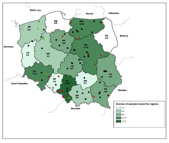 Map showing the voivodeships of Poland and the origin of bats included in the study and ELISA results (black: negative, green: percentage of blocking (PB) > 30%; red: PB > 70%). The number of positive to total samples per region is indicated. Abbreviations: MA (Masovia), DS (Lower-Silesia), WP (Greater Poland), SL (Silesia), PM (Pomerania), LD (Łódź), PK (Lesser Poland), ZP (West Pomerania), LB (Lubusz), KP (Kujawy-Pomerania), OP (Opole), PD (Podlaskie), SW (Świętokrzyskie), WM (Warmia-Masuria), PK (Podkarpackie), LU (Lubelskie).