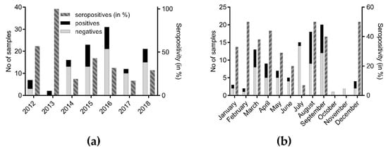 Generally, seasonality of seroprevalence in bats may result from differences in infectious status, behavioral ecology, and population dynamics among bat species [44]. In our study, the highest numbers of seropositive samples were found in August and September, as well as in March and April. The peak in seroprevalence in late summer seems to corroborate the assumption that the breeding period may favor virus transmission and subsequent infections, as demonstrated for Eptesicus fuscus [44]. Of note, significantly higher seroprevalences in this period were also demonstrated in France and Spain [25,45,46]. However, confounding effects cannot be excluded. For example, bat lyssavirus-specific antibodies were shown to persist up to four years in European bats, as exemplified for EBLV-1 [25]; thus, the antibodies detected in bats might not reflect recent exposure to lyssaviruses but might have been acquired much earlier. Additionally, the high degree of variation in seropositivity over time is partly influenced by a low sample size (Figure 2).